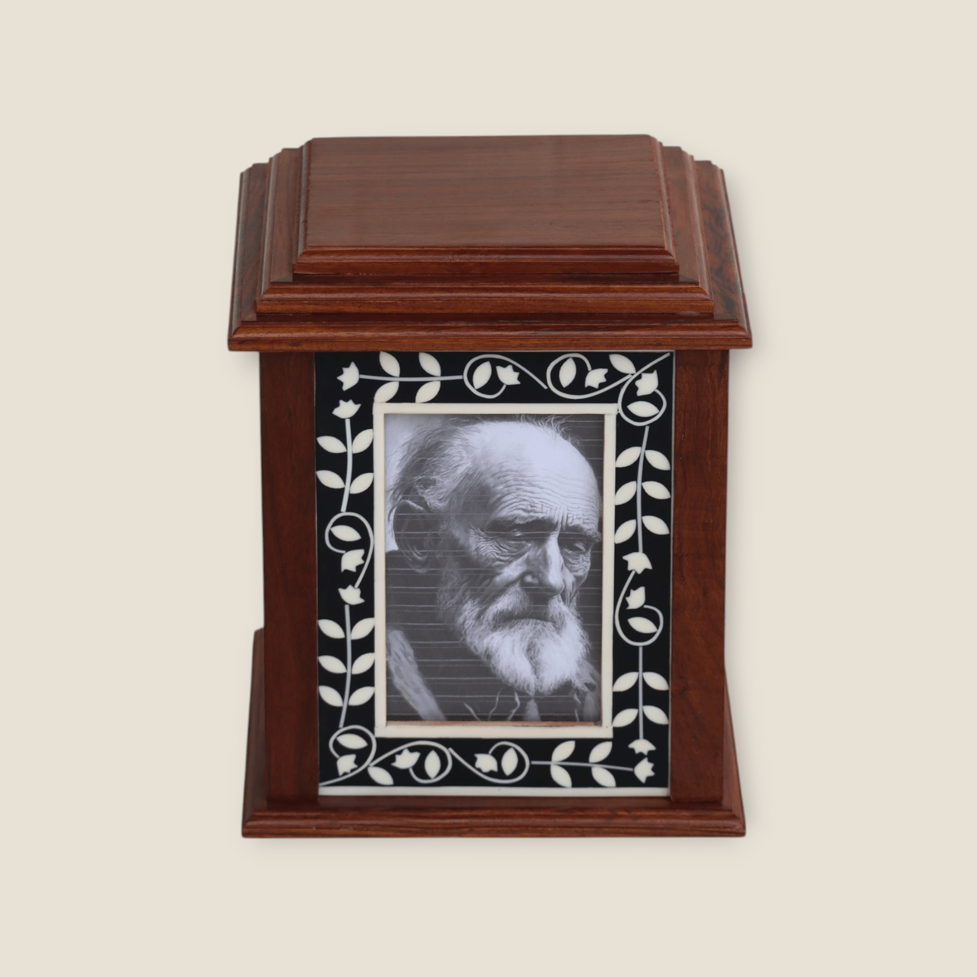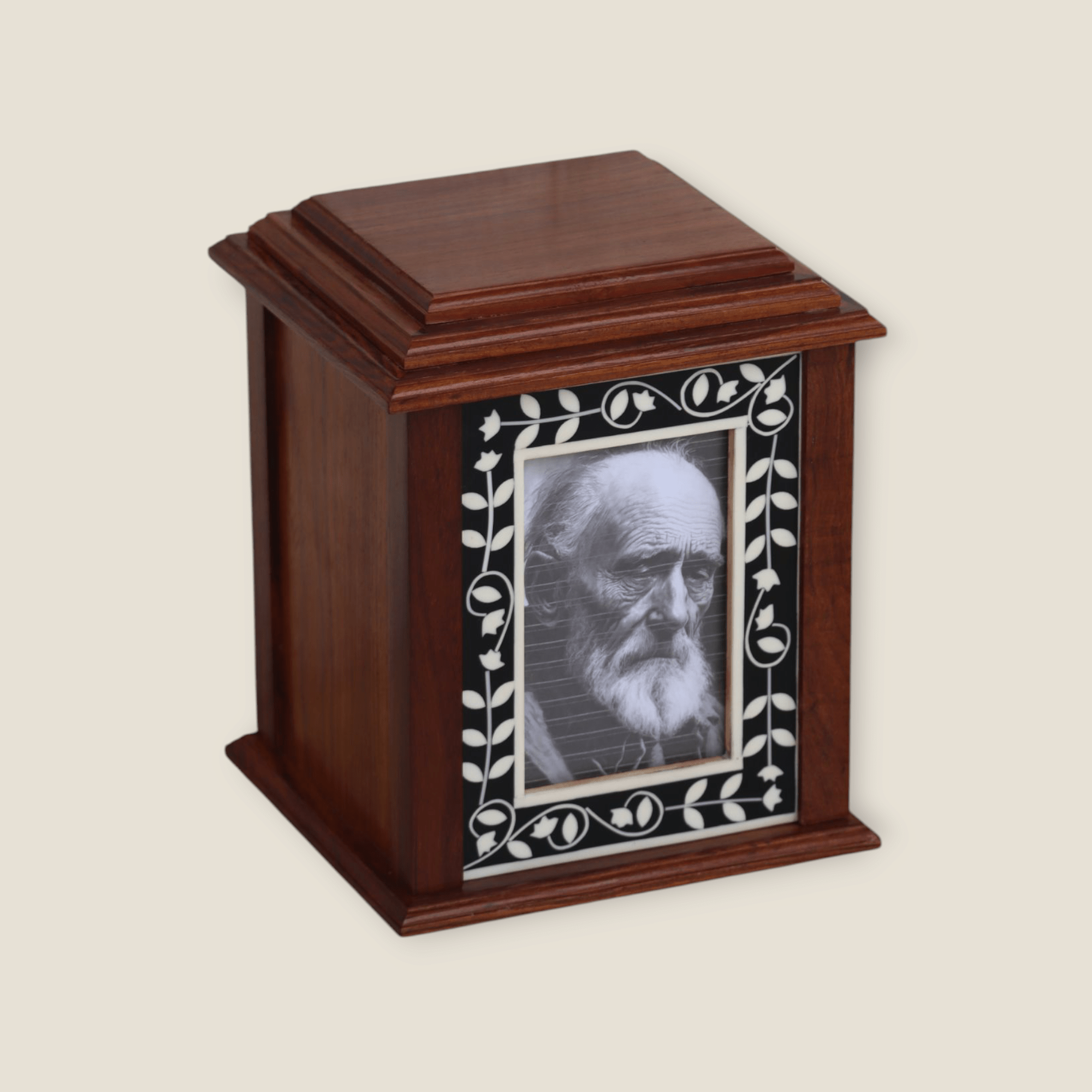At the heart of this urn’s beauty is the rich, deep grain of Indian Rosewood. Known for its durability, lustrous finish, and beautiful natural variations, this premium wood brings a sense of timeless elegance and warmth to each piece. The meticulous crafting process ensures that every urn is unique, reflecting the natural character of the wood.